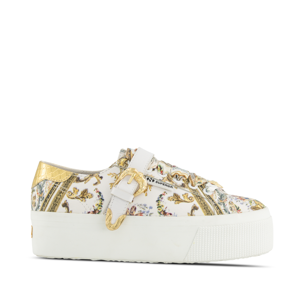 The CAMILLA x Superga 2790 Printed Sneaker in Olympe Ode print embodies decadent palatial parlours adorned in opulent florals and golden flourishes.