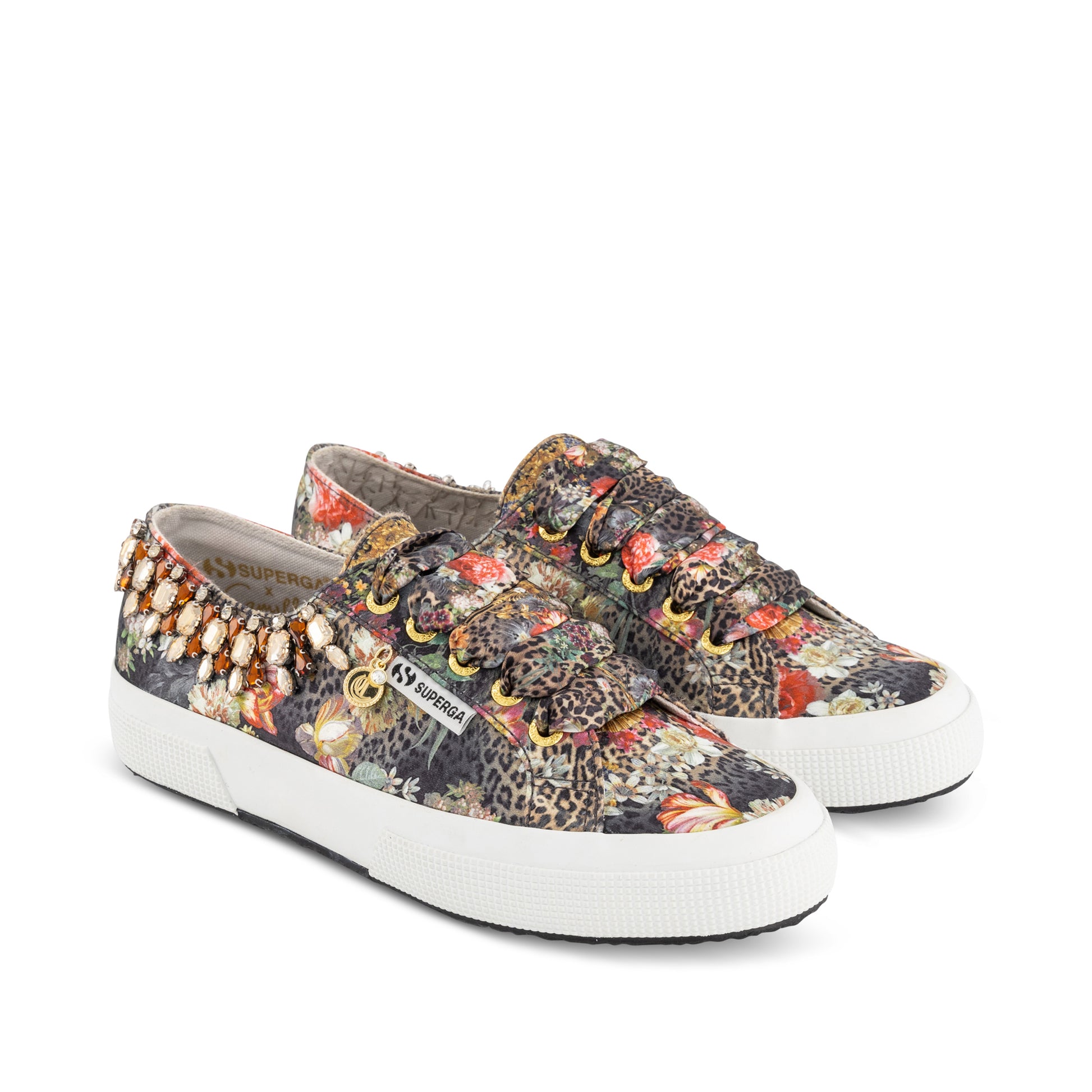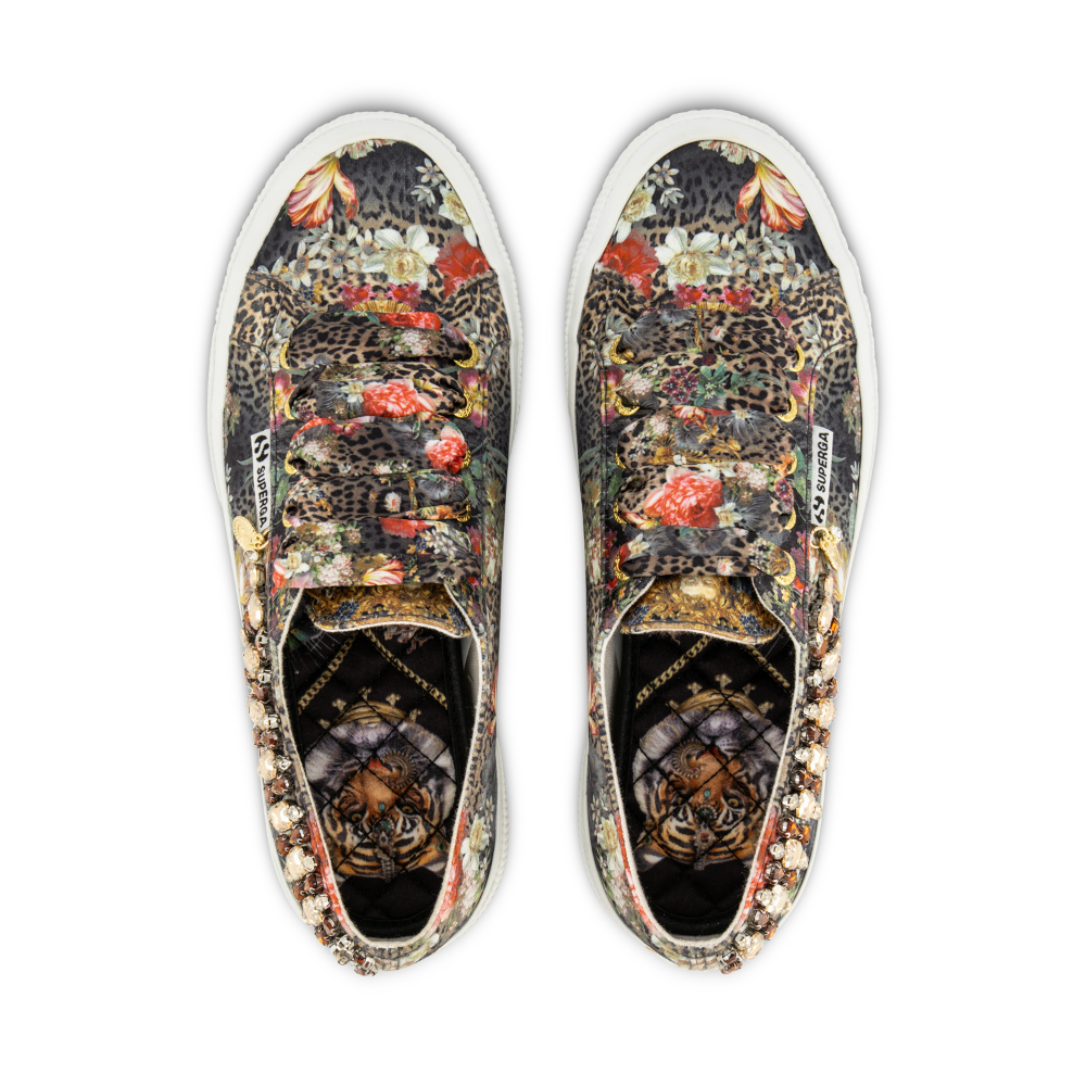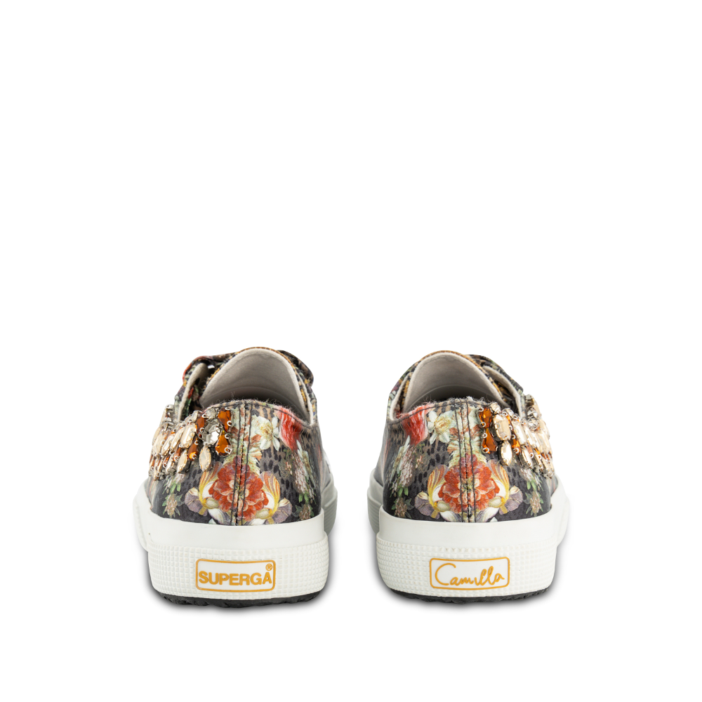 The CAMILLA x Superga 2750 Printed Sneaker in A Night at The Opera print echoes the sweet symphony of frescoes adorning opulent florals, ethereal cherubs and gilded archways. Elevate your footwear with our new designer sneaker collaboration. Adorned with a CAMILLA gold charms and exquisite crystal embellishments, these luxury sneakers bring a touch of opulence to your every step. A bespoke CAMILLA print graces the design, while the interchangeable laces, in both satin print and standard cotton, allow effortless customisation. Designed for comfort, the cushioned printed inner sole features our signature Jaggi head detail while a durable rubber sole with contrast black outer sole adds traction with a modern edge. Embrace the essence of CAMILLA artistry with these sneakers. A limited edition essential.